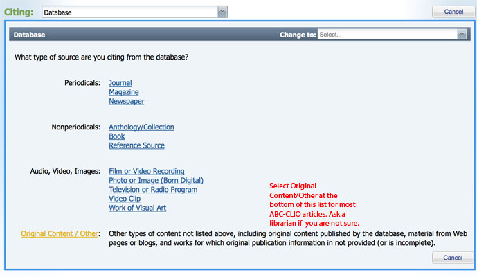 Articles in ABC-CLIO databases are almost always original content. Here is how to cite sources found in this database.