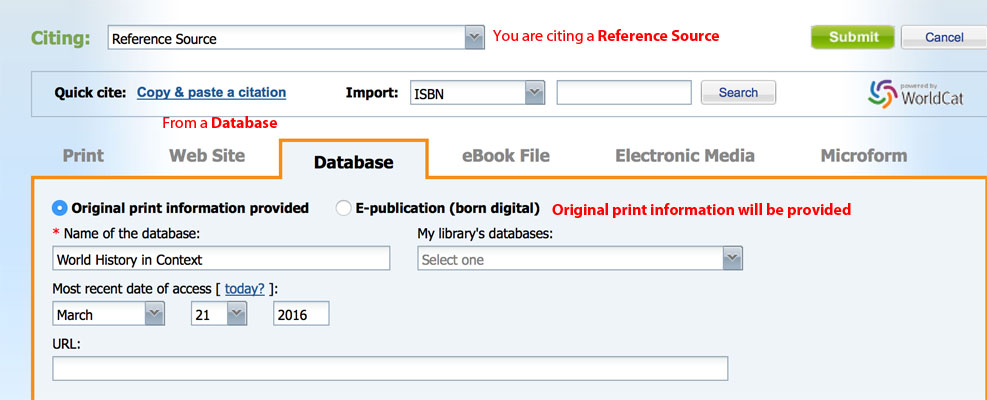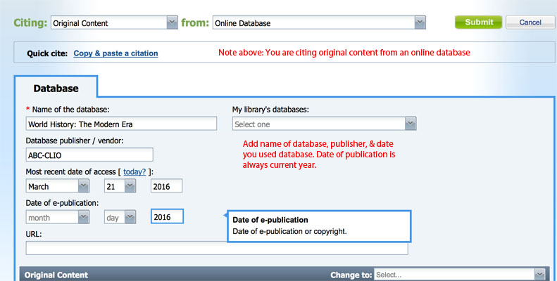 Step 3. Add the required information: Name of database, date you got the information, date of publication (in this case, current year). You do not need to add a URL when citing a database.