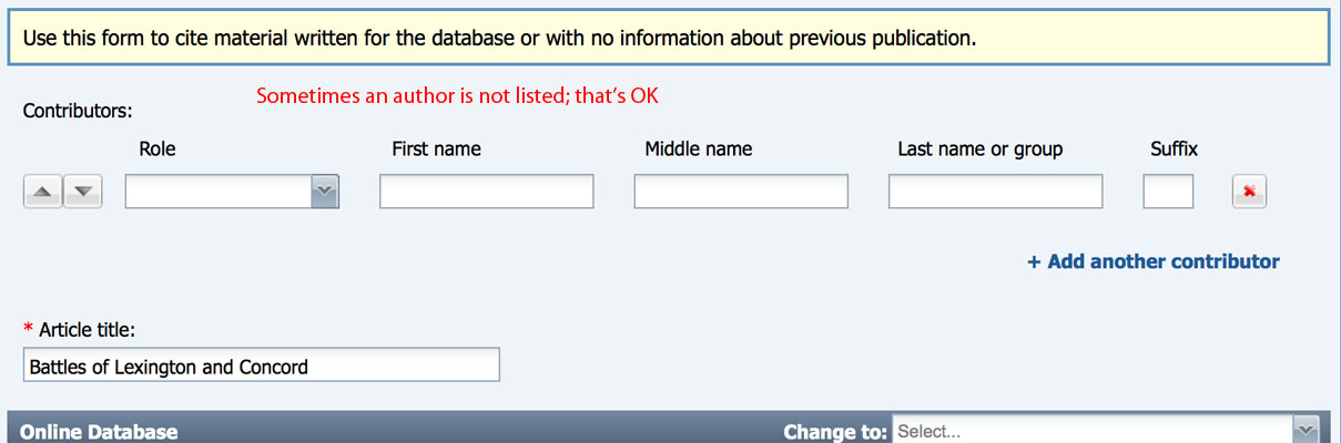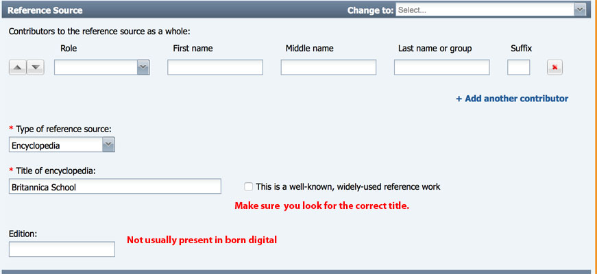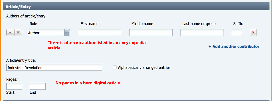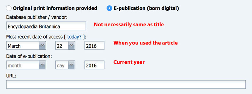 Articles in all of our online encyclopedias are born digital. They are not reprinted from any print sources. Here is how to cite sources found in an online encyclopedia.