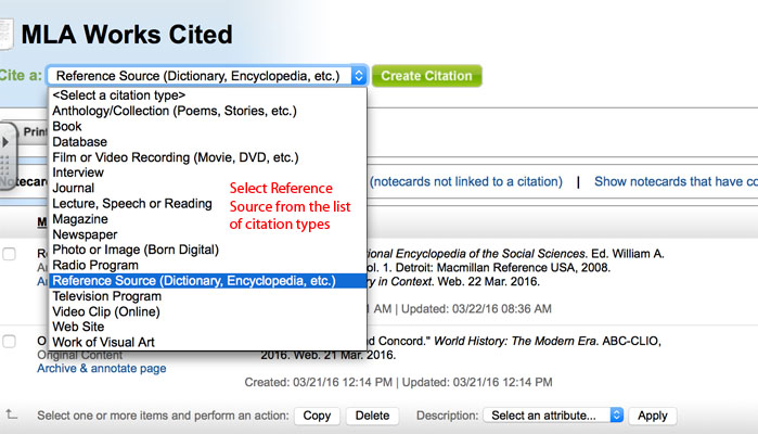 Step 1. Select reference from the list of citation types and click the create citation button.