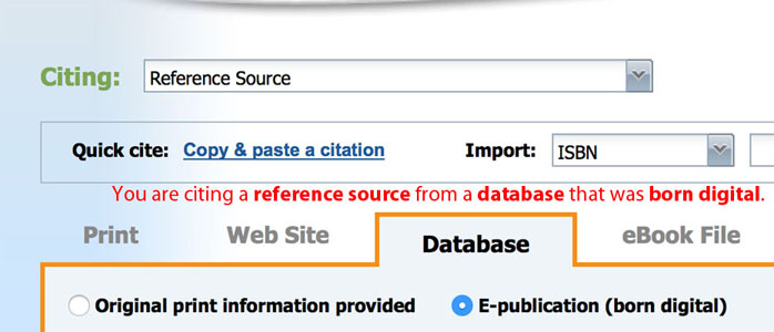 Step 2. Select the Database tab and the e-publication (born digital button) from the choices on the next screen.